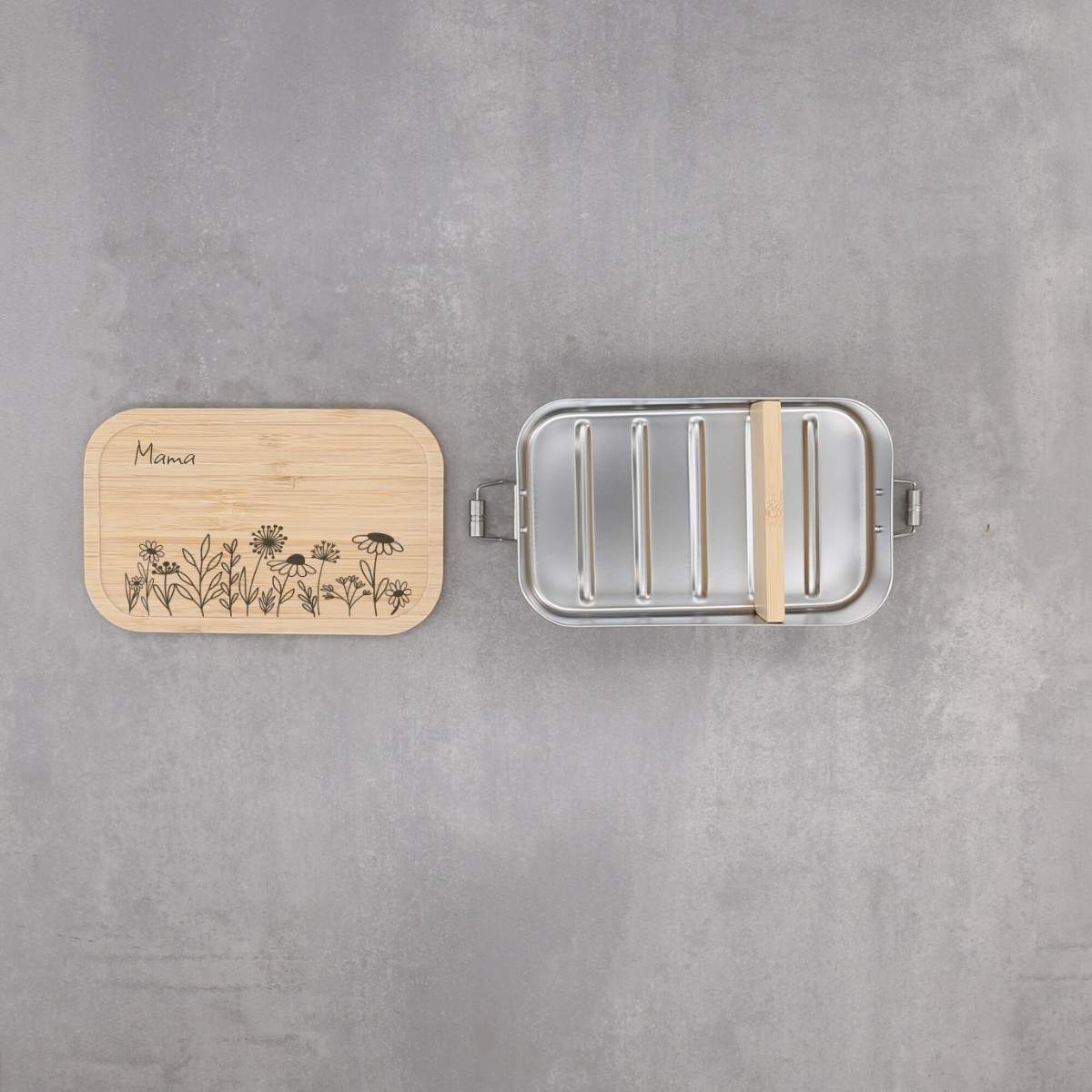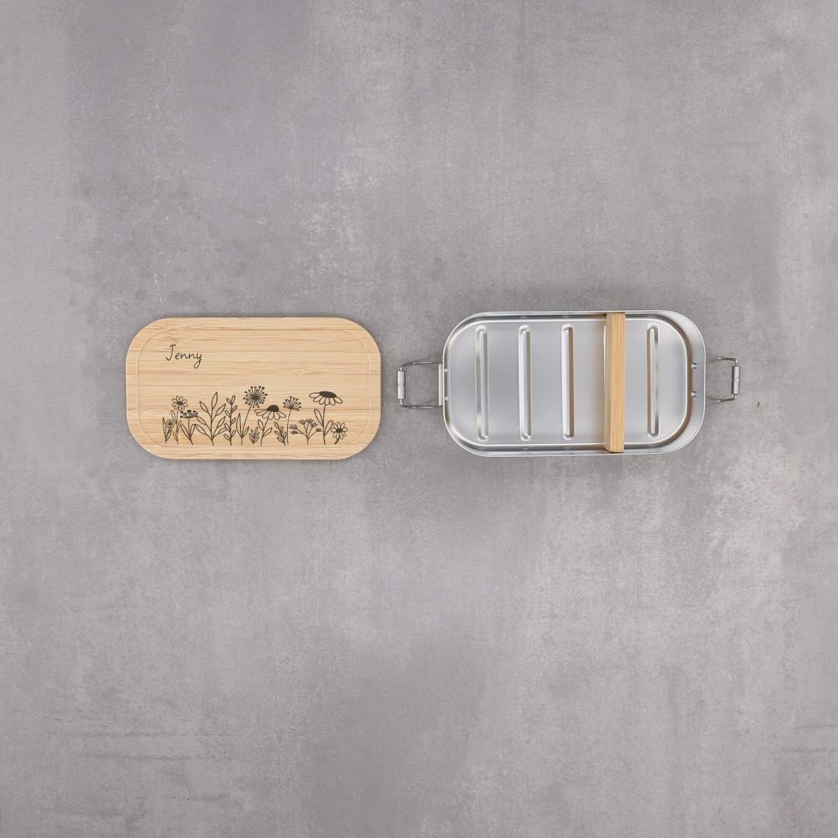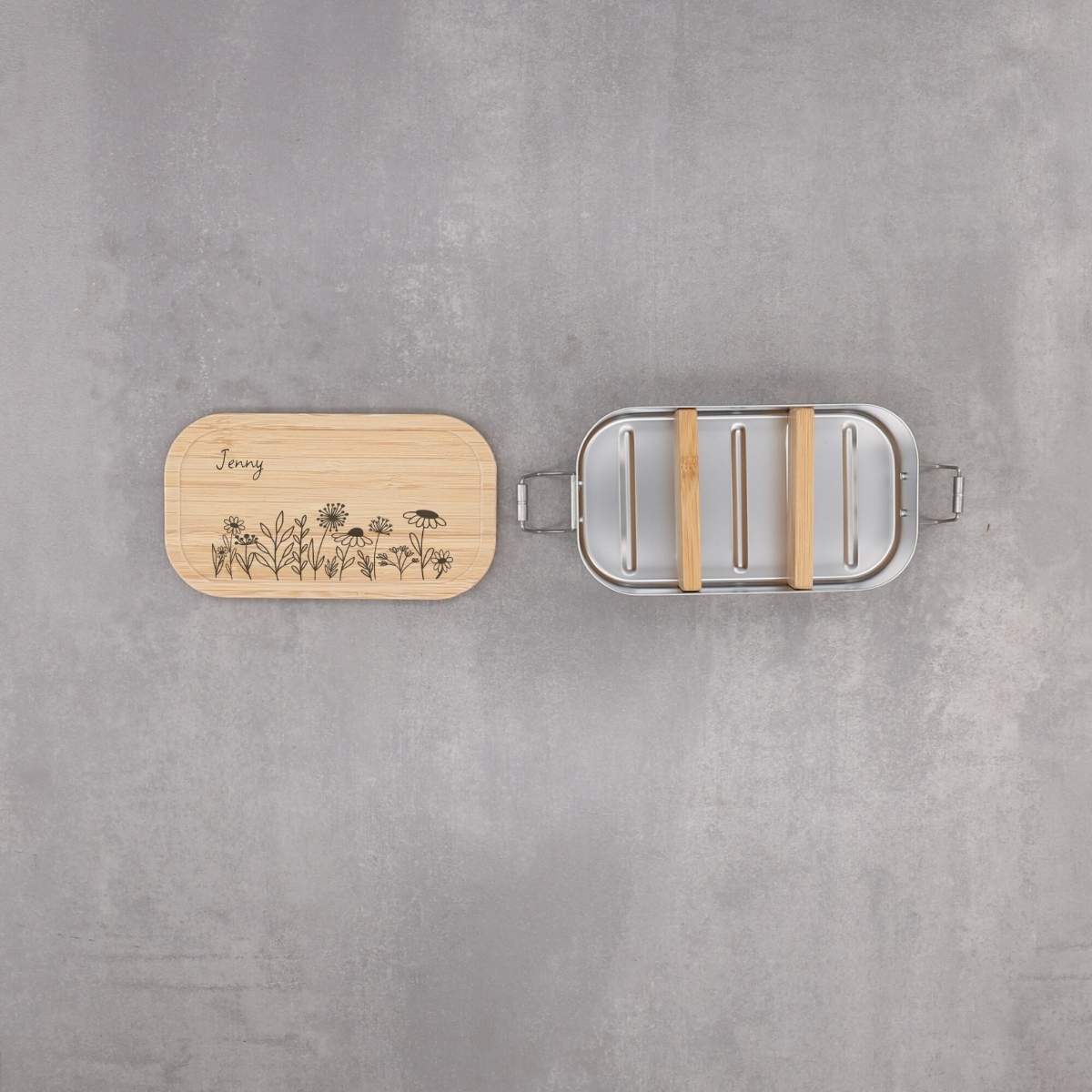 Lunchbox aus Edelstahl mit Bambusdeckel – personalisierbar mit Blumenmotiv