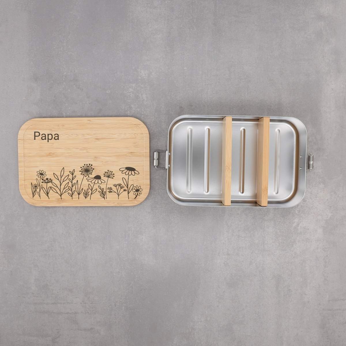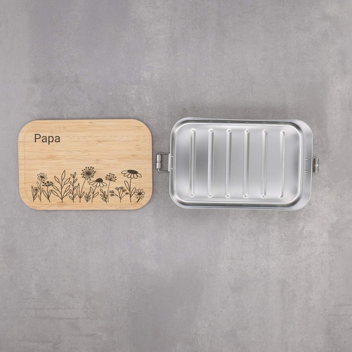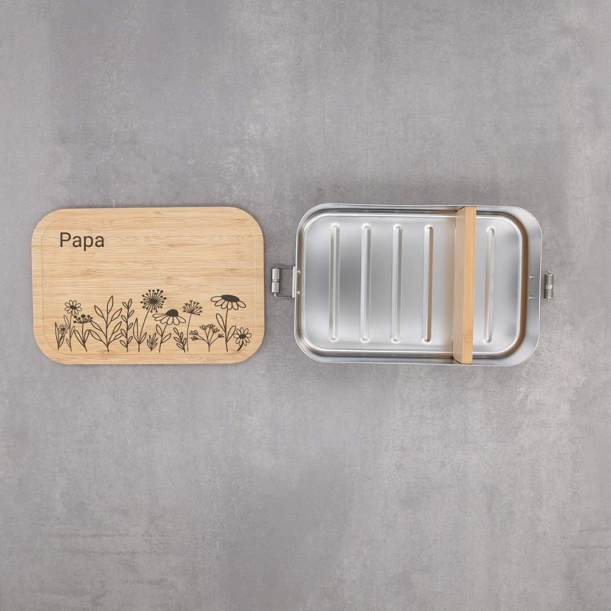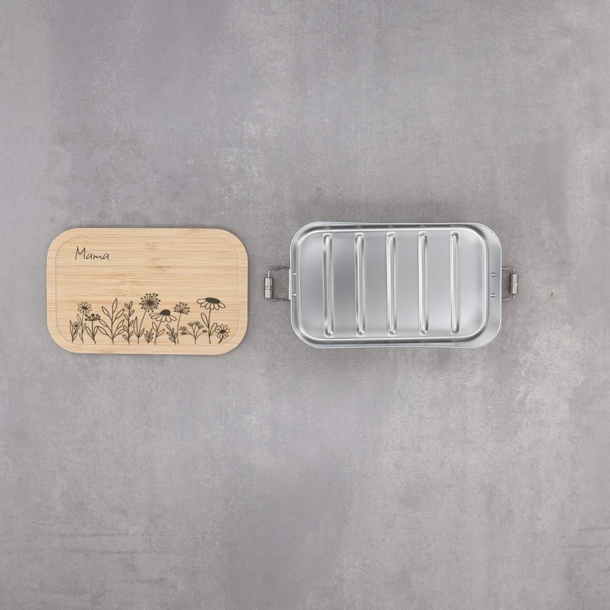 Lunchbox aus Edelstahl mit Bambusdeckel – personalisierbar mit Blumenmotiv