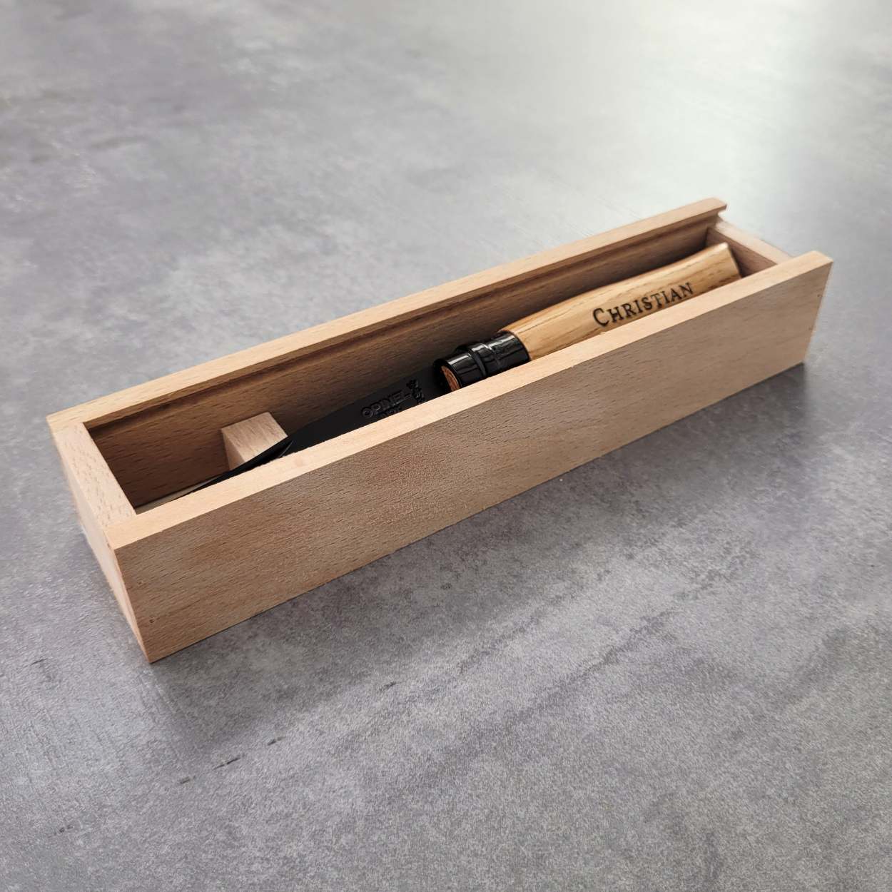 Edles Opinel Taschenmesser Black Oak in Holzbox mit Gravur