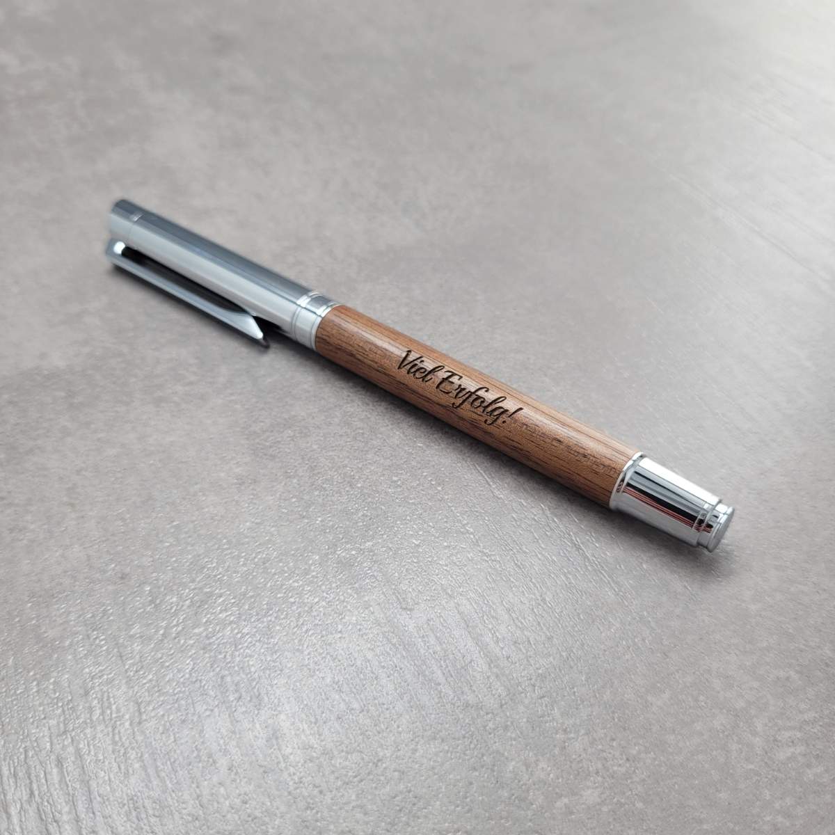 Die Füller sind aus Nussbaumholz gefertigt. Nussbaum ist eher dunkel und hat eine auffallend schöne Maserung. Das verschafft dem Stift eine gleichmäßige Optik, auf dem beste Gravurergebnisse erzielt werden können. Das Holz ist angenehm in der Hand und sehr griffig.