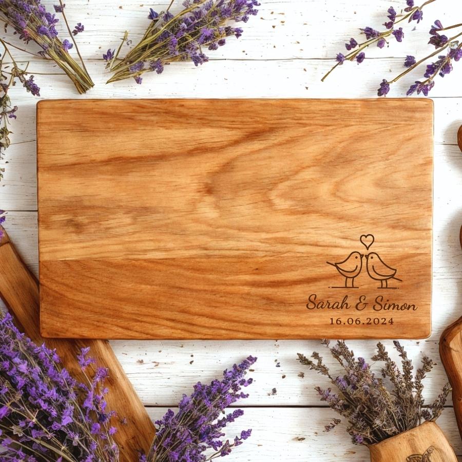Personalisiertes Vesperbrett "Love Birds" aus Eichenholz – Ein romantisches Geschenk zur Hochzeit!
