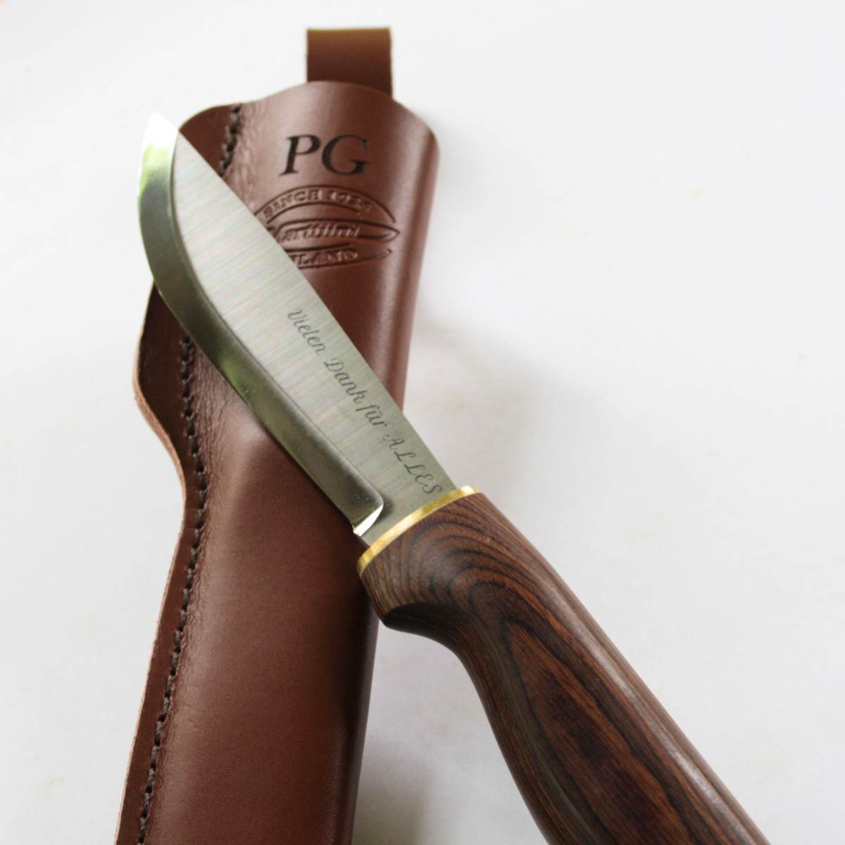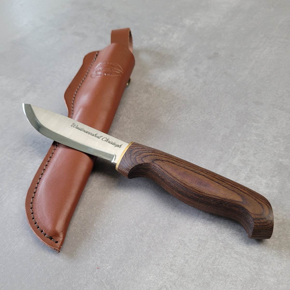 Wir gravieren Deinen Wunschtext auf die Klinge, auf der Seite ohne Martiini Herstellerprägung. Gerne kannst Du im Textfeld zusätzlich Initialen für die Lederscheide angeben.