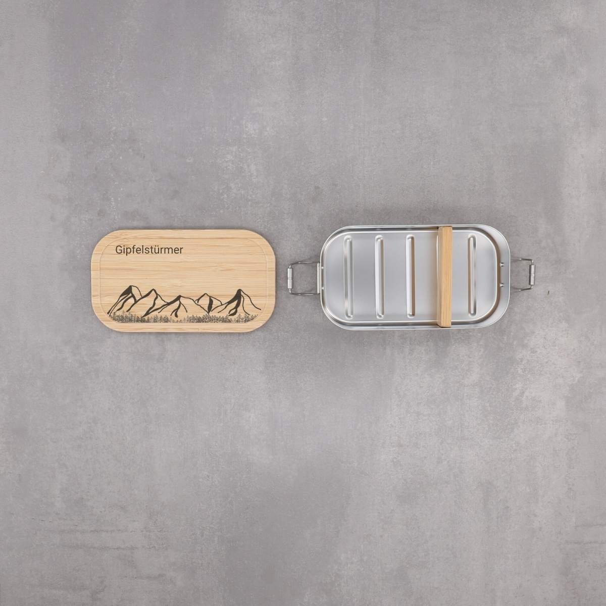 Lunchbox aus Edelstahl mit Bambusdeckel – personalisierbar mit Bergmotiv und Wunschtext