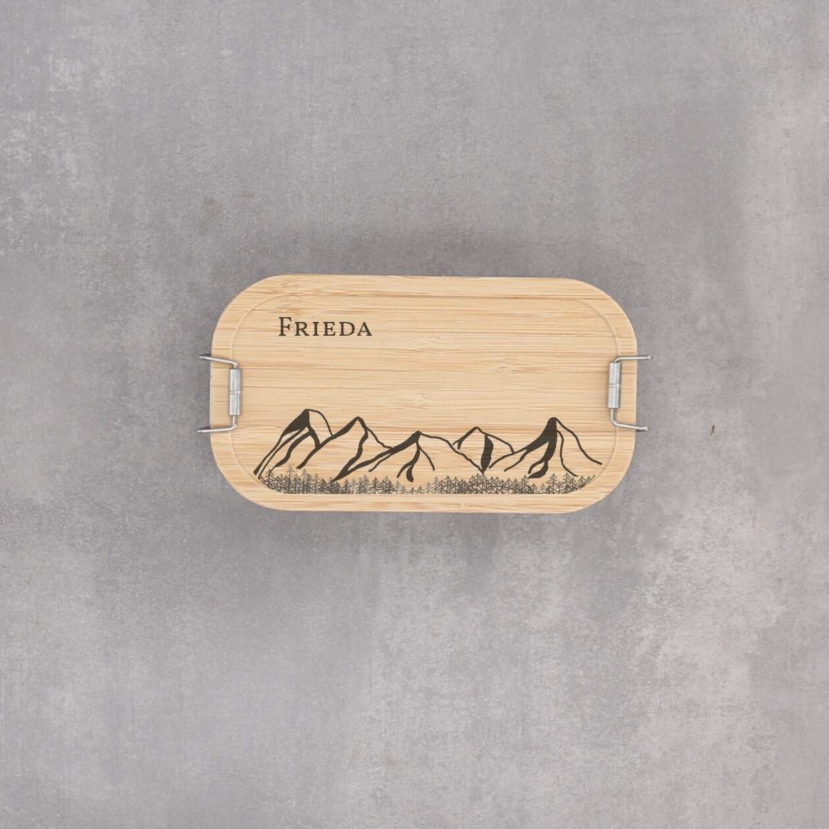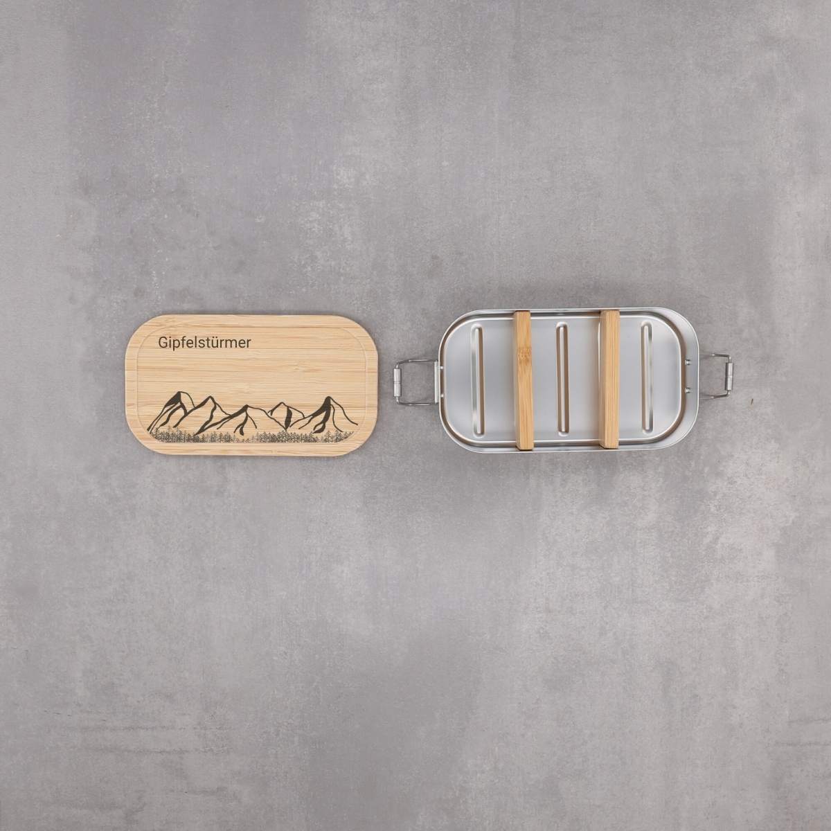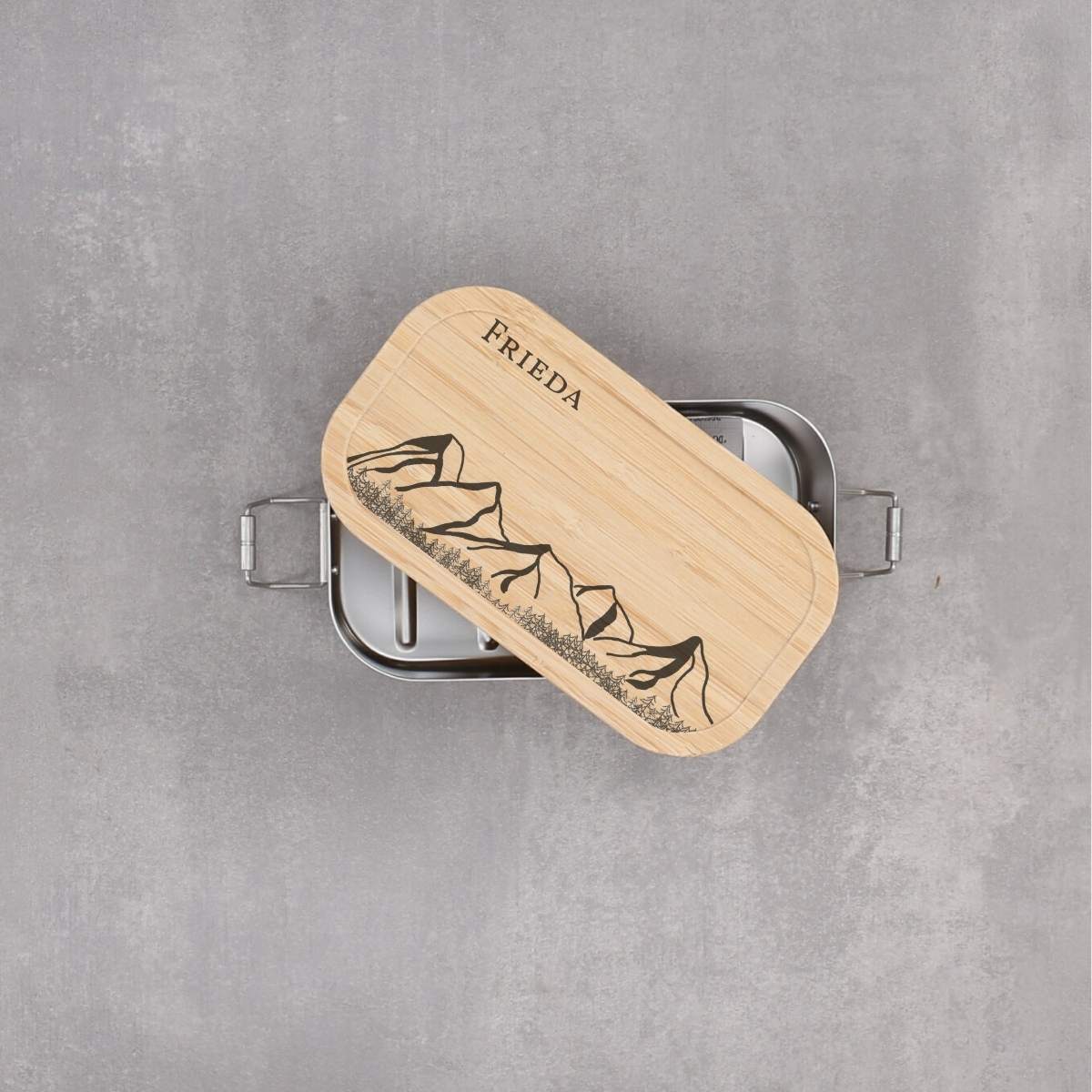Lunchbox aus Edelstahl mit Bambusdeckel – personalisierbar mit Bergmotiv und Wunschtext