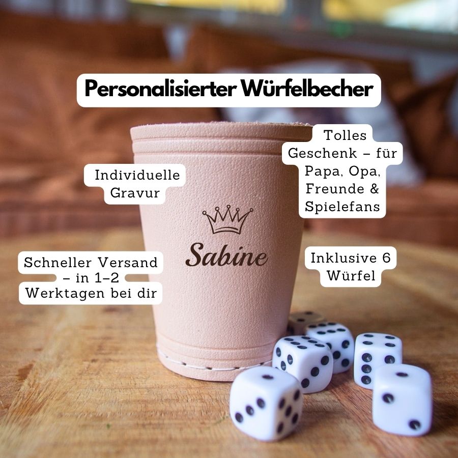 Ein stilvoller Würfelbecher für alle Fans von Kniffel, Poker und anderen Würfelspielen – ideal als Geschenk für Männer, Väter, Großväter oder Spieleliebhaber. Der hochwertige Lederbecher überzeugt durch edle Optik, angenehme Haptik und eine individuelle Gravur nach Wunsch.