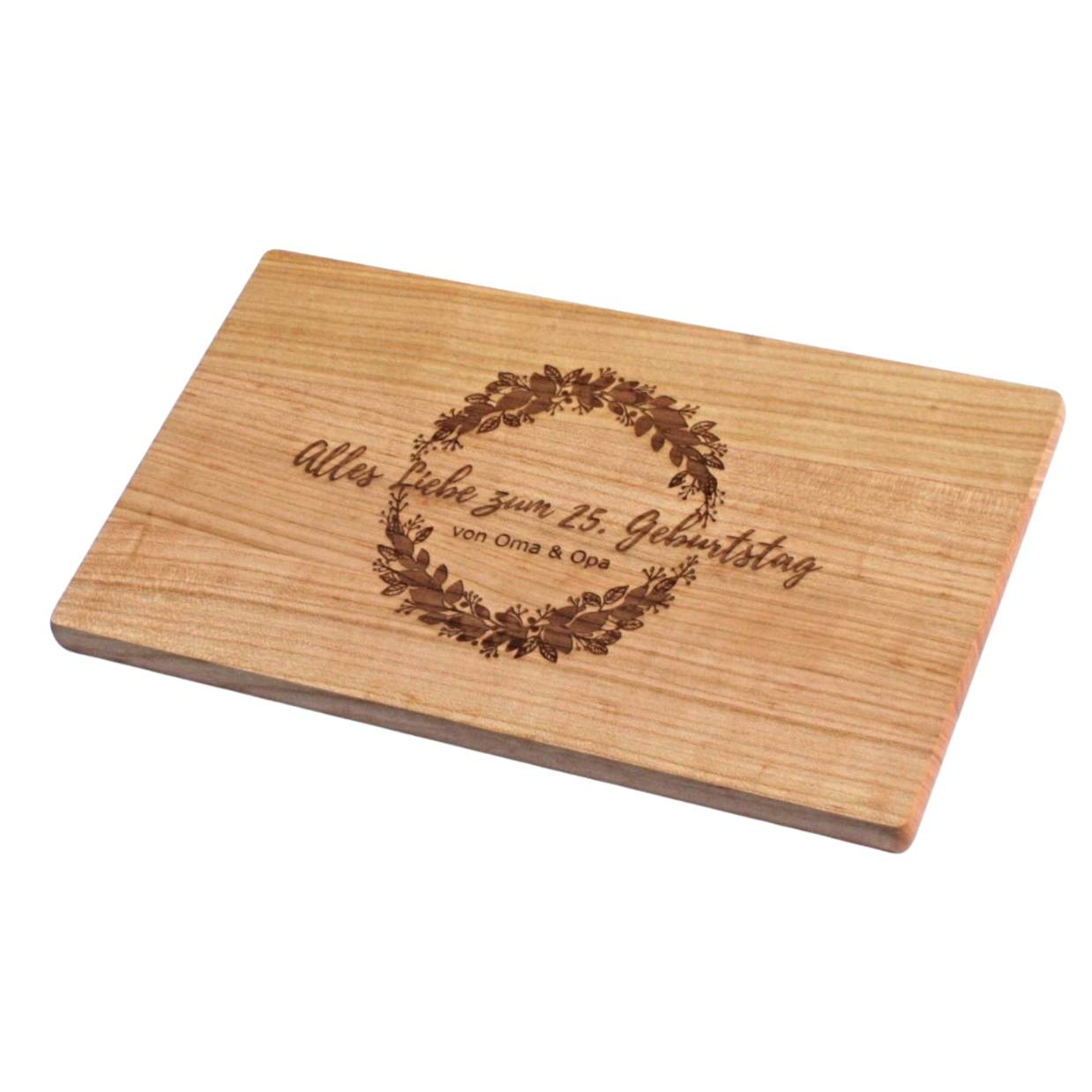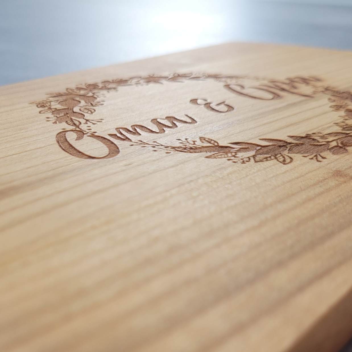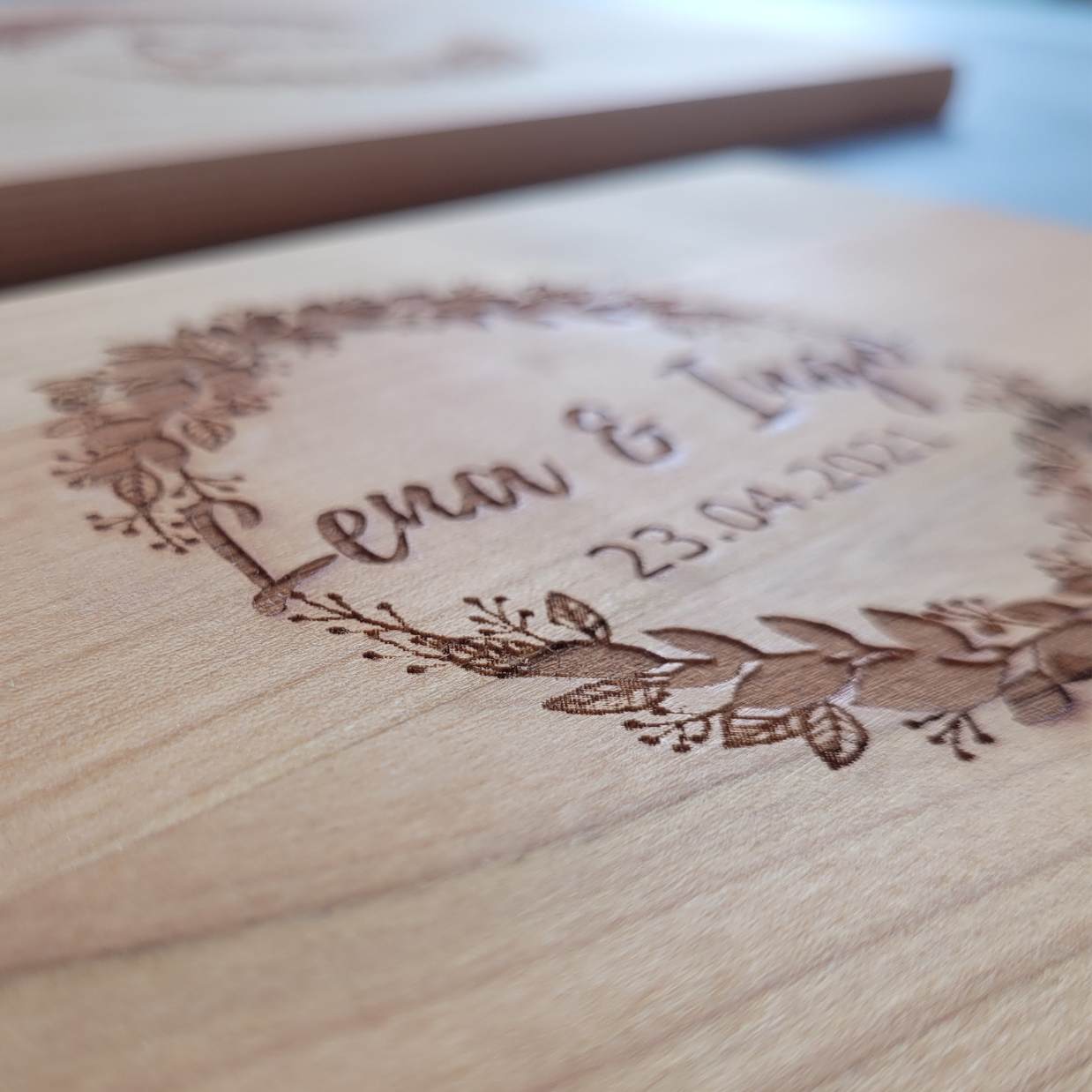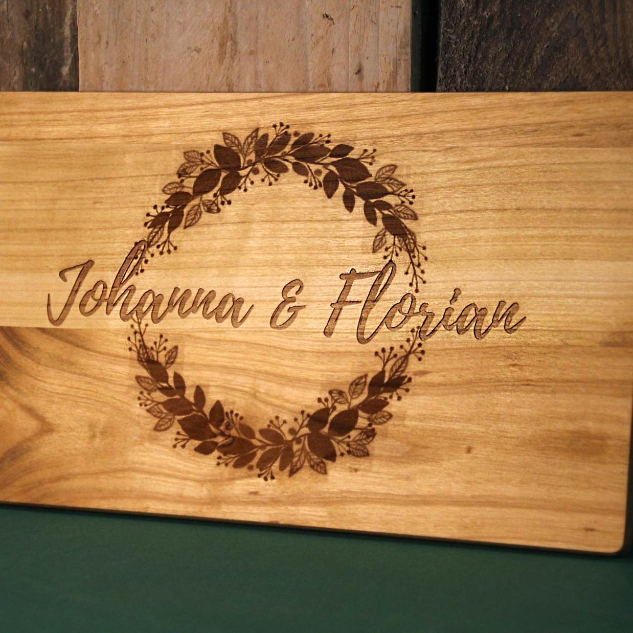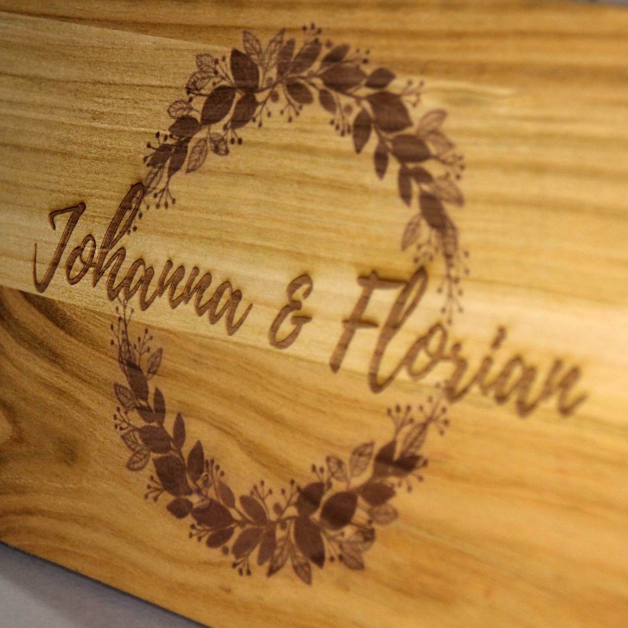 Mit einer Lasergravur wird jedes Holzbrett zum Unikat. Die Gravur wird mit einem Laser in das Holz gebrannt und ist damit sehr lange beständig, wie es sich für ein hochwertiges Geschenk gehört. In den Blumenkranz gravieren wir einen Text / Namen Deiner Wahl.