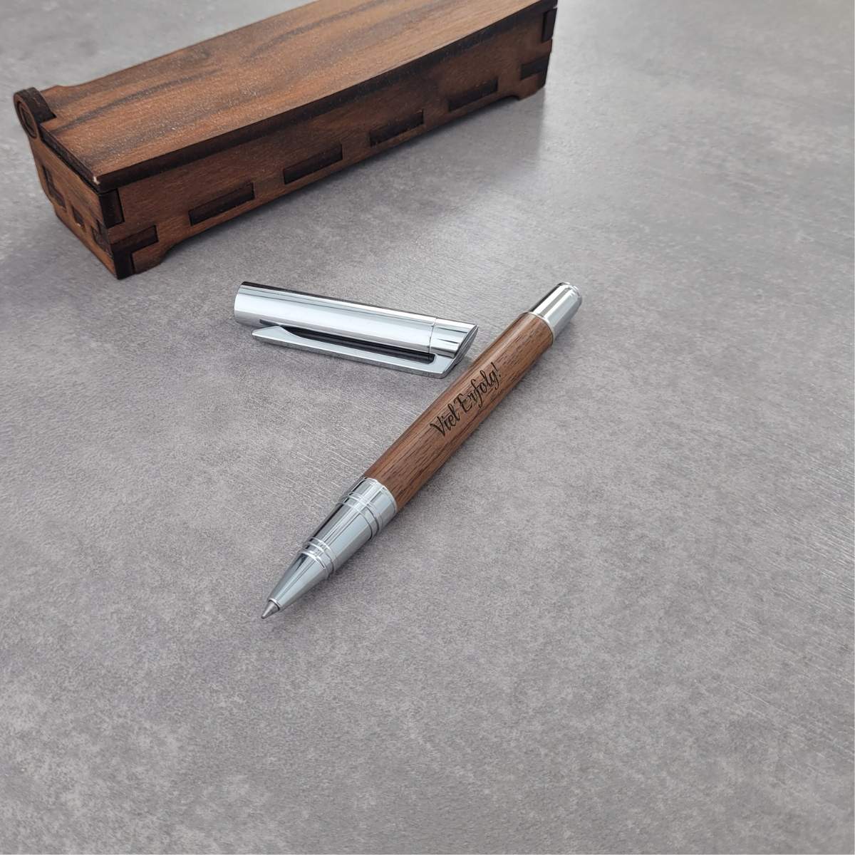 Die Stifte sind aus Nussbaumholz gefertigt. Nussbaum ist eher dunkel und hat eine auffallend schöne Maserung. Das verschafft dem Stift eine gleichmäßige Optik, auf dem beste Gravurergebnisse erzielt werden können. Das Holz ist angenehm in der Hand und sehr griffig.