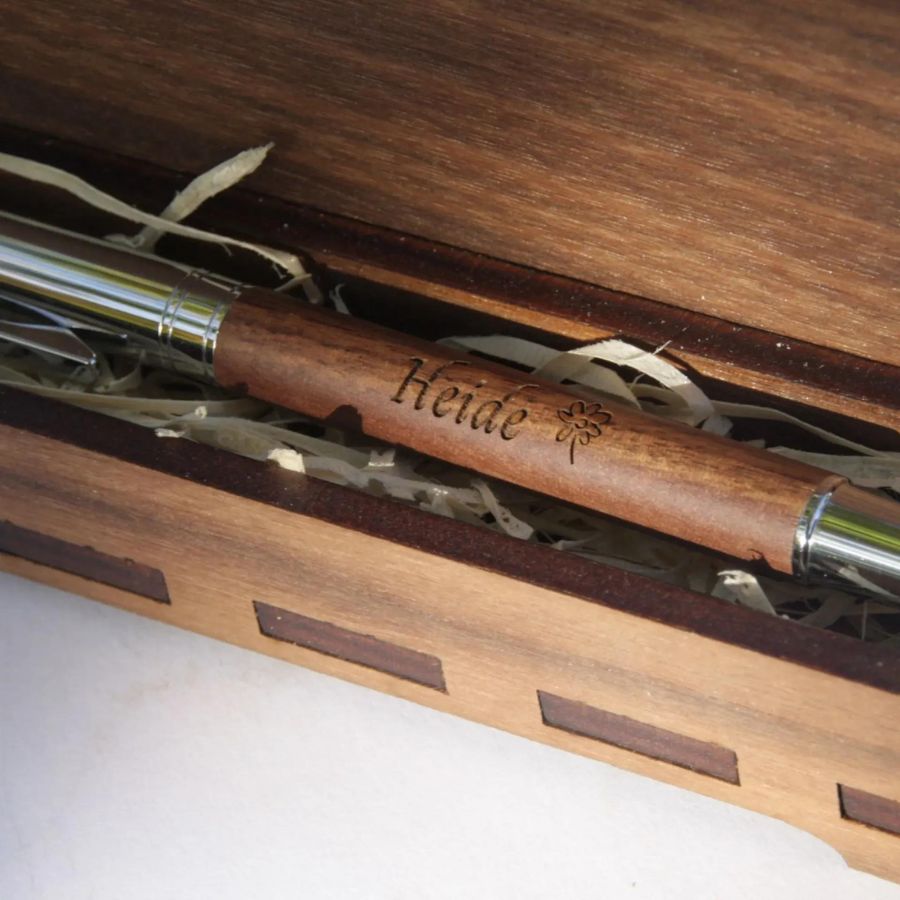 Mit einer Lasergravur wird jeder Stift zum Unikat. Gerne gravieren wir den Rollerball-Pen mit Deiner Wunschgravur auf dem Holz - sei es ein Name, Datum oder Symbole.