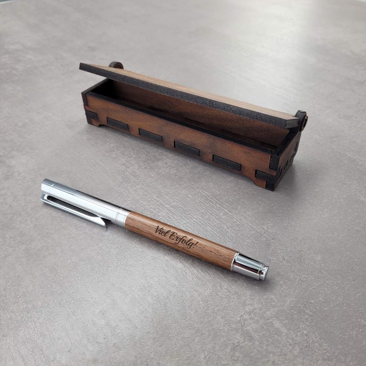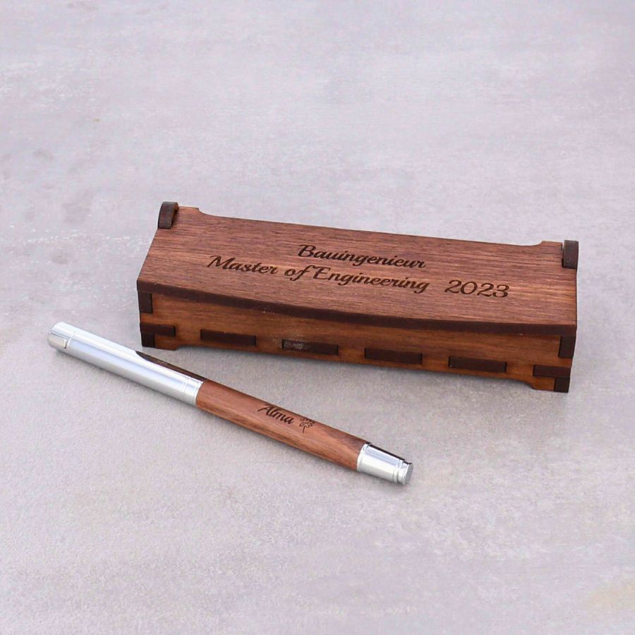 Das dazu passende Holzkästchen aus Nussbaumholz ist sehr stabil und ein echter Blickfang auf dem Geschenketisch und später auf dem Schreibtisch. Es lässt sich auf der Oberseite individuell gravieren.