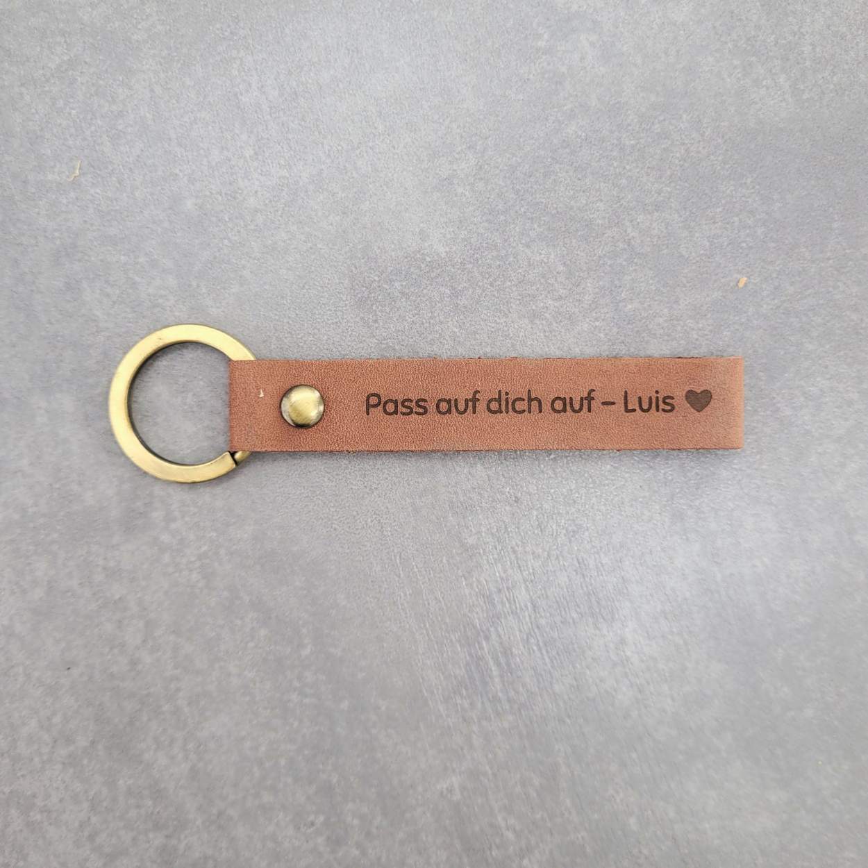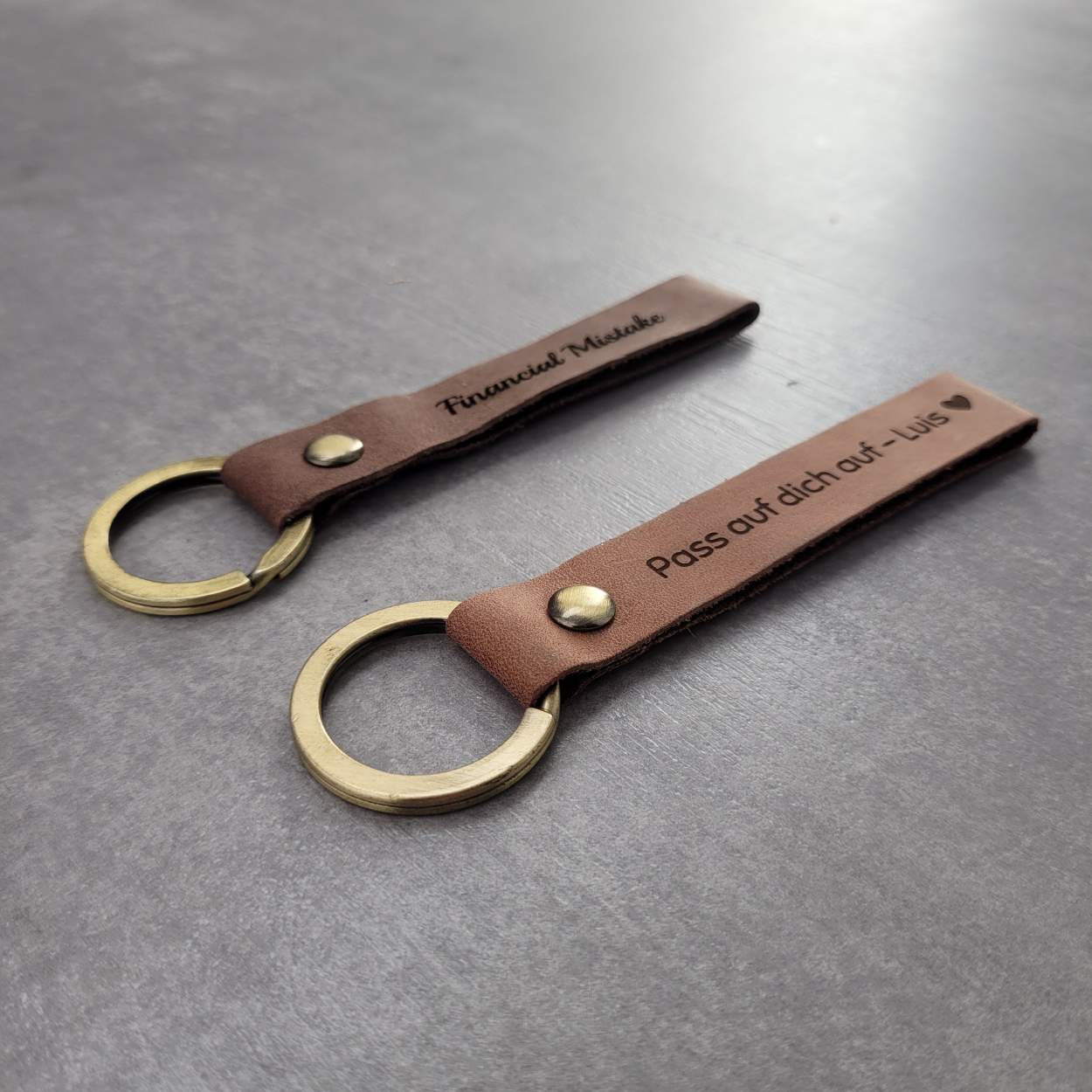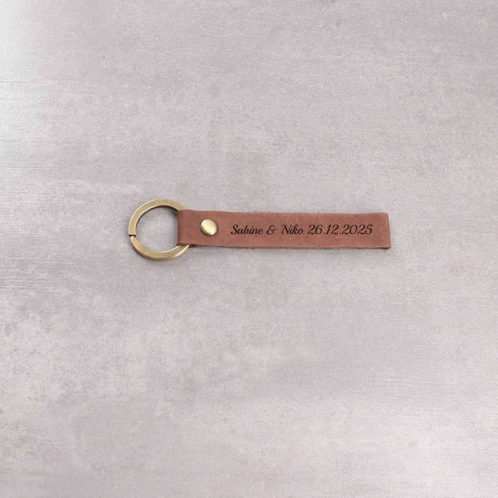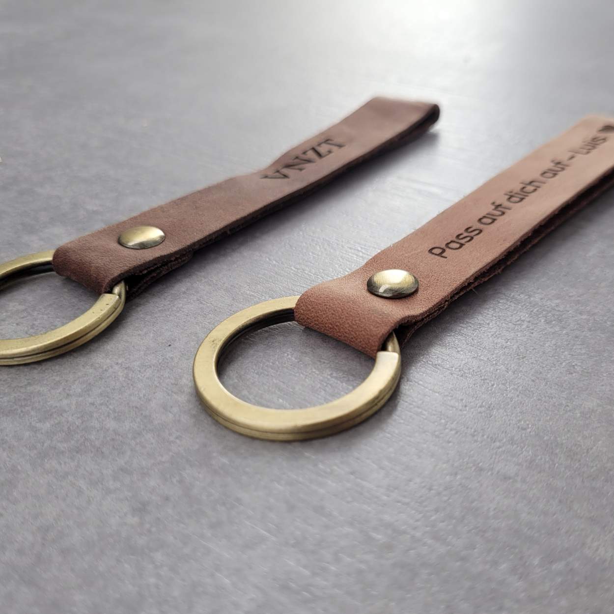 Wähle zwischen hellem oder dunklem Rindsleder und füge einen individuellen Text hinzu – zum Beispiel Deinen Namen oder ein Datum. Jeder Anhänger wird sorgfältig gefertigt und präzise graviert, damit er zu einem echten Unikat wird.